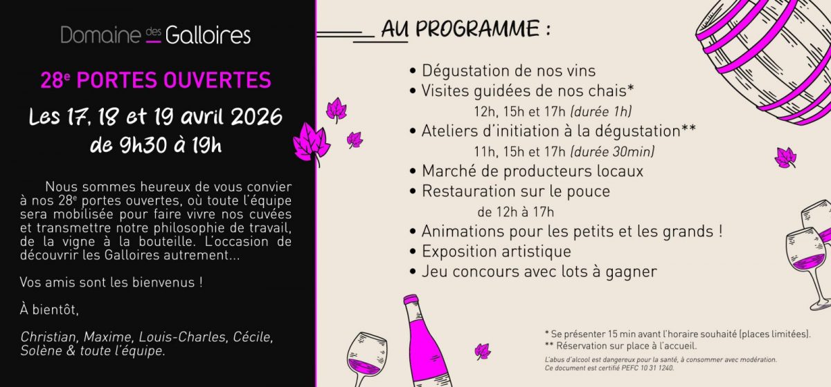 Le Domaine des Galloires vous ouvre ses portes pour un week-end d'animations ! Toute l'équipe sera mobilisée pour faire vivre les cuvées et transmettre leur philosophie de travail, de la vigne à la bouteille. L'occasion de découvrir les Galloires autrement...