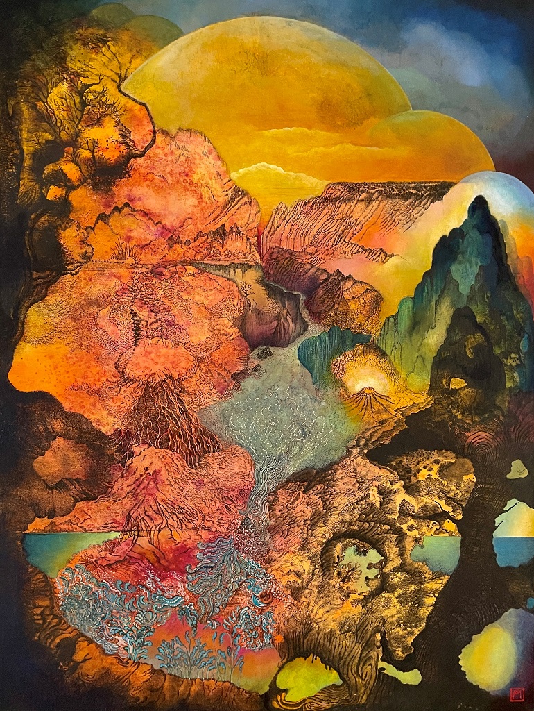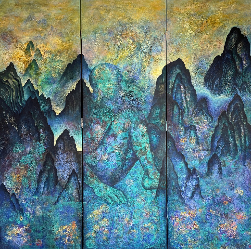 Inspirée par ses quatorze années passées à Shanghai, Mélanie Abellan compose ses toiles à partir de monotypes réalisés à l’encre de Chine et rehaussés à la peinture acrylique. Elle finalise parfois ses œuvres par l’ajout de fils brodés, héritage de sa formation en art textile. Entre corps et paysages, son travail interroge la relation que nous tissons avec notre environnement naturel et l’empreinte que nous y laissons.