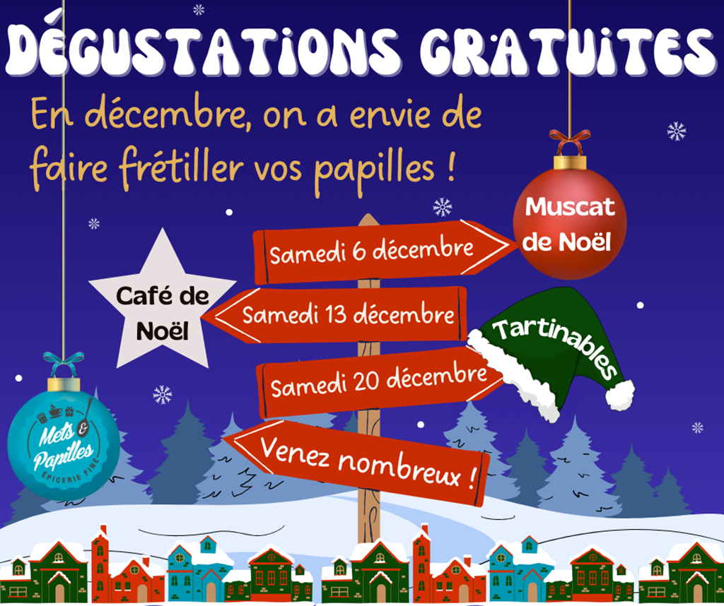 On y est, décembre est arrivé !Tous les samedis jusqu'à Noël, l'épicerie Mets et Papilles vous propose une dégustation gratuite.