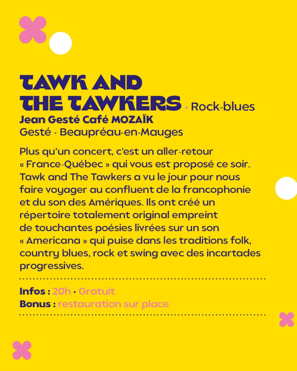 Tawk and The Tawkers a vu le jour pour nous faire voyager au confluent de la francophonie et du son des Amériques. Ils ont créé un répertoire totalement original empreint de touchantes poésies livrées sur un son « Americana » qui puise dans les traditions folk, country blues, rock et swing avec des incartades progressives.