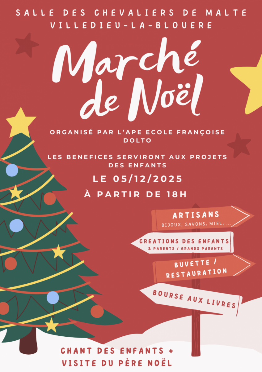L'Association des Parents d’Élèves (A.P.E.) de l'École Françoise Dolto vous invite à son traditionnel Marché de Noël ! Venez vivre un moment magique et solidaire en famille.