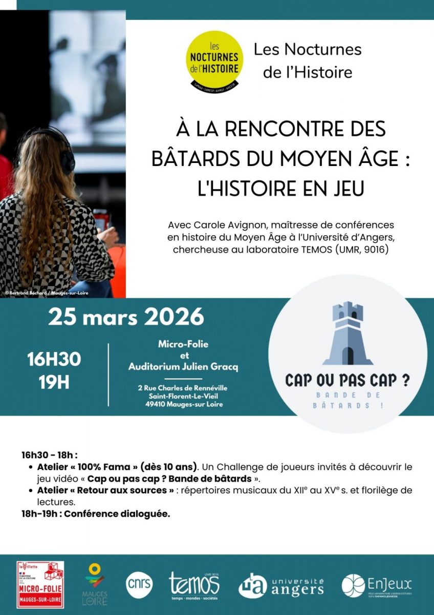 De 16h30 à 18h, l’historienne vous invite à tester le prototype de jeu vidéo sur tablette « Cap ou pas cap ? Bande de bâtards ! ». Incarnez un personnage, déjouez les pièges de la bâtardise et partie après partie, découvrez la société médiévale sous un nouveau jour (à partir de 10 ans).