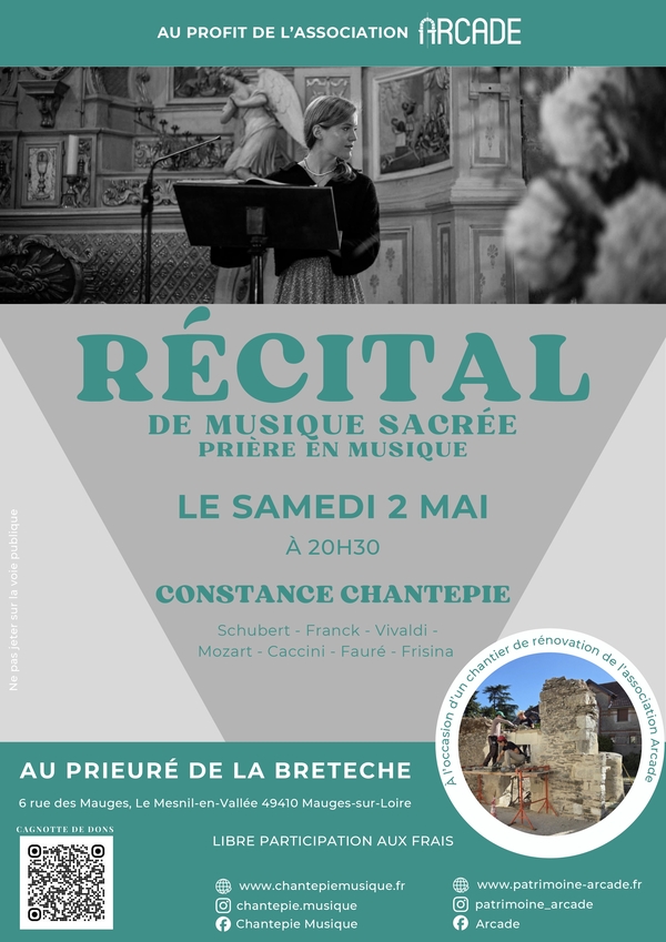 Ce récital de musique sacrée sera donné par Constance Chantepie qui interprétra Schubert , Franck , Vivaldi, Mozart, Caccini, Fauré et Frisina.