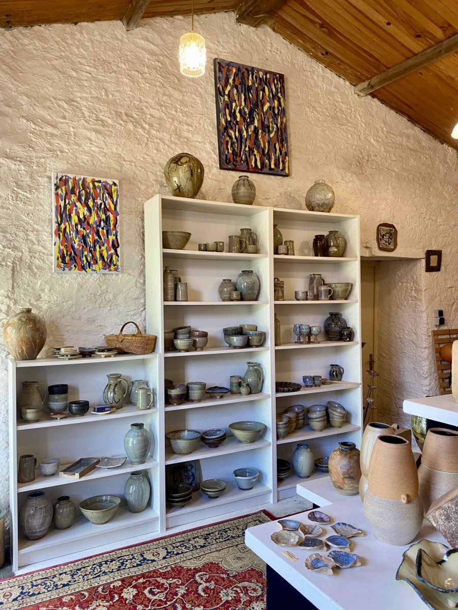Attenant à sa boutique, l’atelier de Pascal Durot révèle un univers brut et chaleureux : murs de pierre, poutres anciennes, outils patinés par le temps. C’est ici qu’il façonne le grès, un matériau qu’il compose lui-même en mariant terre de Saint-Amand-en-Puisaye, porcelaine et argile du Fuilet.