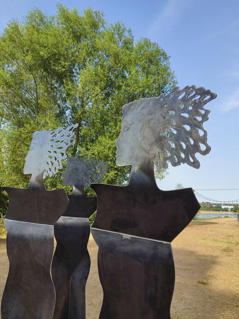 Trois silhouettes identiques, à échelle humaine, sortent de l’acier et déambulent, cheveux au vent, dans la même direction.