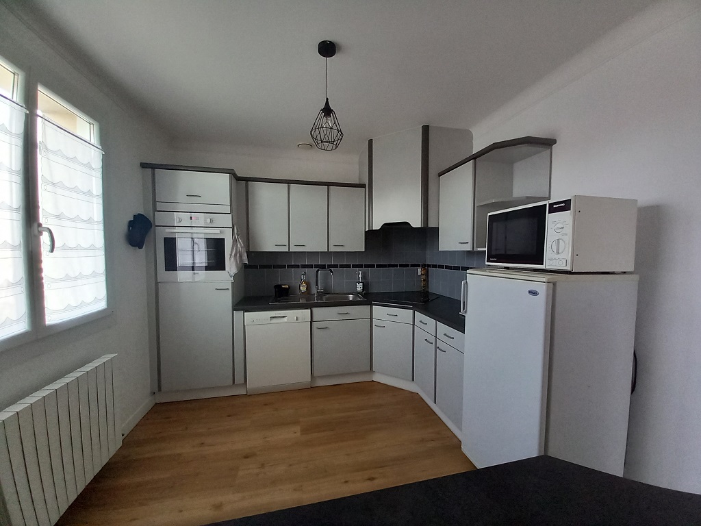 La cuisine est entièrement aménagée et équipée : four, plaque de cuisson, réfrigérateur, cafetière