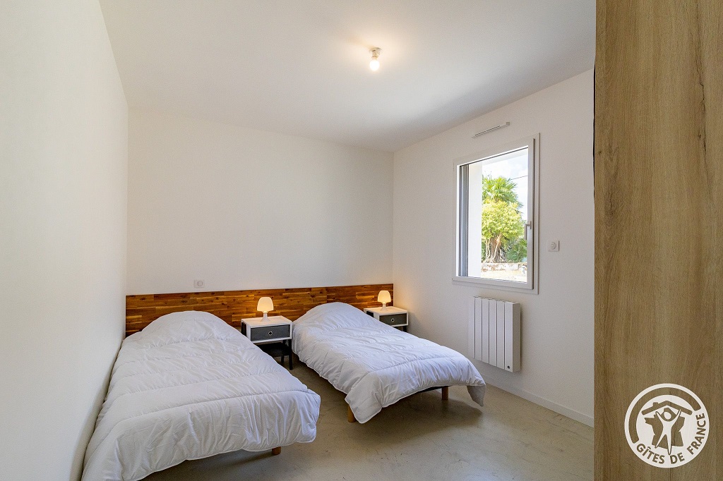 Ce gîte moderne, situé dans le vignoble du Muscadet entre Nantes et Angers, peut accueillir jusqu'à 4 personnes avec 2 chambres (une avec lit double, l'autre avec 2 lits simples).