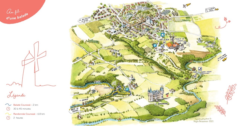 Sentier d'interprétation autour du circuit de Courossé, avec un point de vue exceptionnel sur la rivière et la vallée de l'Evre. Sept panneaux d'interprétation aident à la visite.