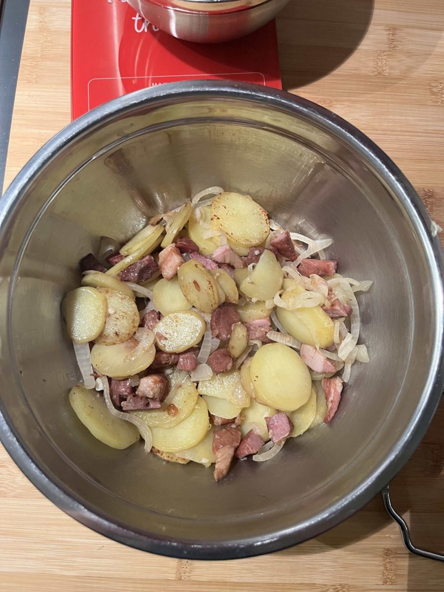- Étape 3 : Dans une poêle, faites revenir les rillauds, l’oignon et l’ail. Ajoutez les pommes de terre et poursuivez la cuisson environ 10 minutes. Laissez tiédir.