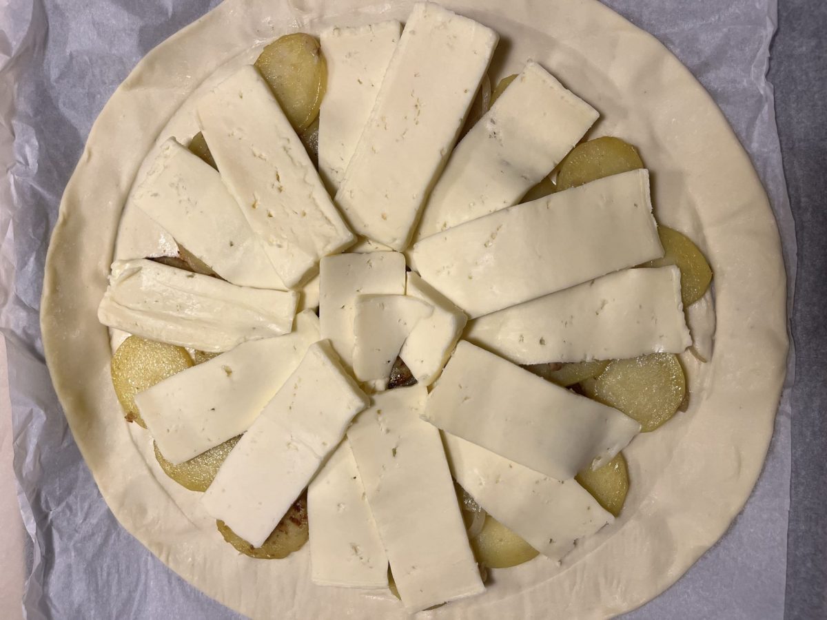 - Étape 5 : Répartissez la poêlée de pommes de terre aux mini-rillauds, la tomme d’Anjou coupée en lamelles puis recouvrez la seconde pâte à tarte. Soudez bien les bords