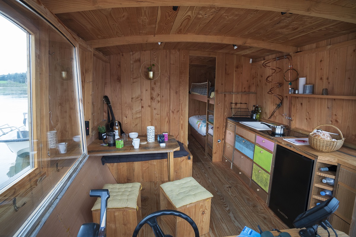 Long de 12m et large de 3,5m, cette toue cabanée fabriquée en Maine-et-Loire, peut accueillir jusqu’à 12 passagers d’avril à la mi-décembre.
