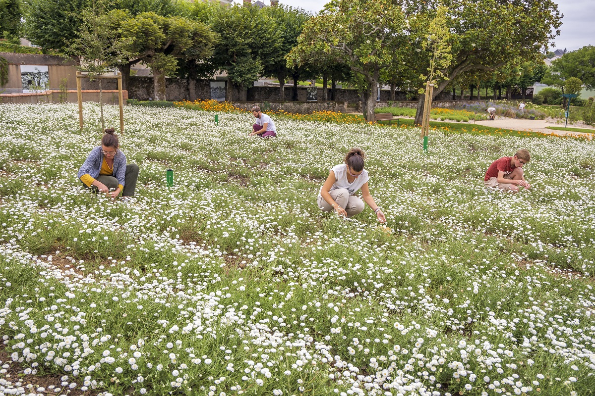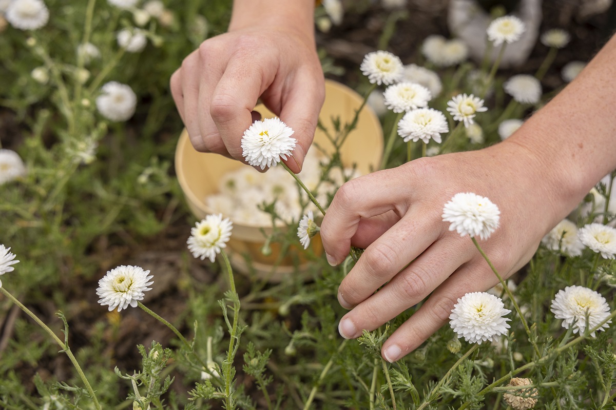 Cueillette de camomille romaine au Jardin Camifolia ©D.Drouet