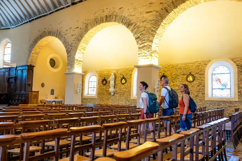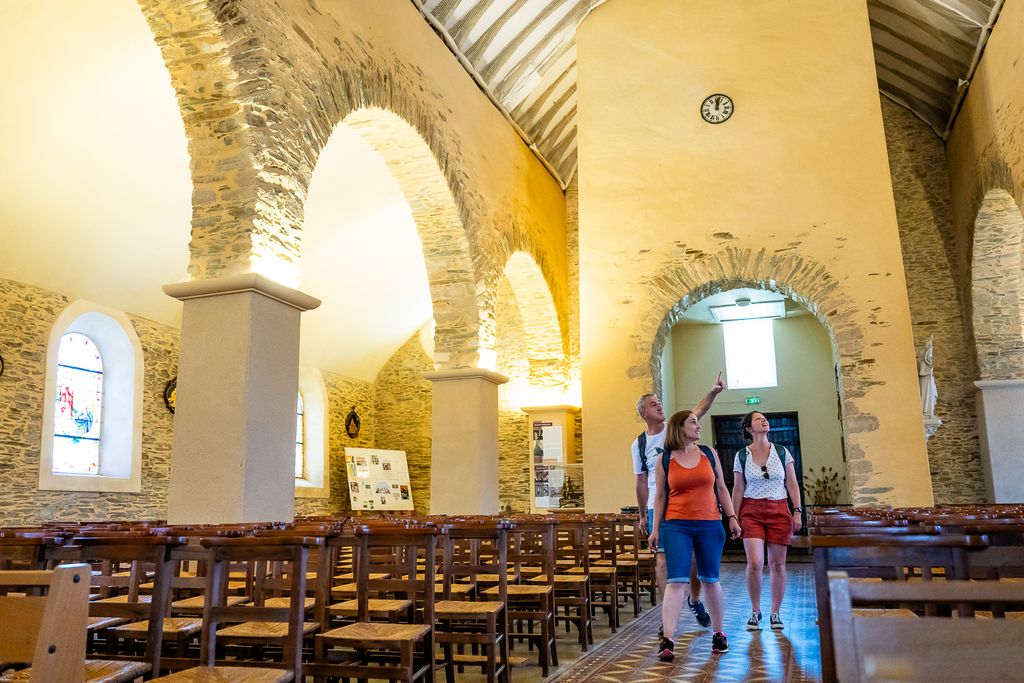 Entrez dans l'église et découvrez la superbe charpente en coque de bateau renversée.