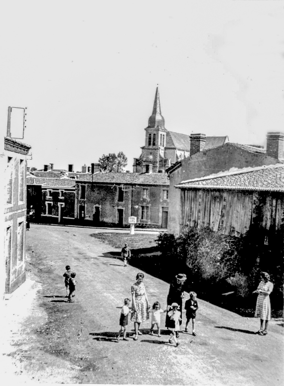 Cette borne Michelin a été posée dans les années 1930… Un espace de verdure délimite « la départementale » allant vers Beaupréau. Elle semble large, comparée à la route menant à la Chapelle-Aubry. Le clocher domine l’espace et semble le protéger. La rue calme est propice à la promenade. On est certainement dimanche; enfants et parents sont tous « endimanchés ». L’automobile fait son apparaition mais les bourgs ne sont pas encore totalement voués à la voiture.