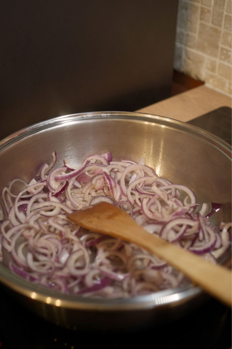 - Faites chauffer l’huile d’olive dans une seconde casserole. Faites revenir les oignons émincés pendant 5 min jusqu’à ce qu’ils soient dorés.
