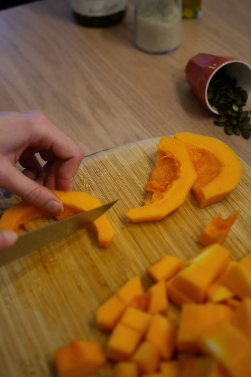 - Épluchez et coupez le butternut en dés. Faites cuire les dés de butternut préalablement au four pendant 30 min à 180° avec de l’huile d’olive.